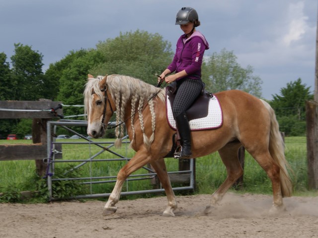 "Ich spüre Galano kaum", stellt sie fest. Ihre Beine sind abgespreizt, und ihr Sitz fühlt sich schwammig an. Unter dem Bein spürt die Reiterin unangenehm die Gurtstrippen. Der Sitz fühlt sich härter an als bei den anderen Filzsätteln. Fürs Pferd ist dieses Modell weich gepolstert. Das Reitgefühl bessert sich nach einigen Runden imSchritt und Trab etwas.
